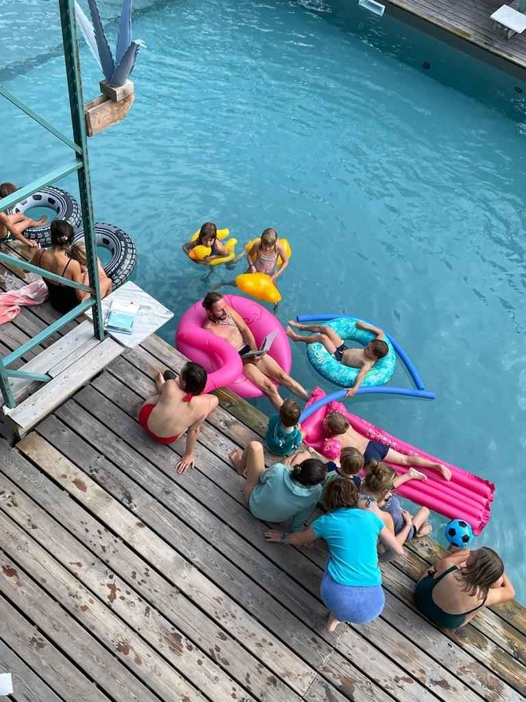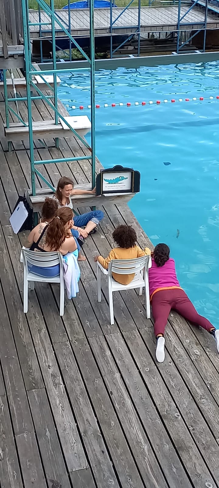 May bikes from the library in Ixelles to the Flow pool to read aloud. From her bakfiets she conjures kamishibai and books about rivers, storms, flatfish, pirates, mermaids and lifeguards. While you enjoy bobbing in the water, May reads aloud from the poolside or from her air mattress. Readings in French and Dutch!
