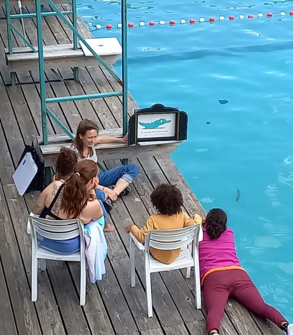 May bikes from the library in Ixelles to the Flow pool to read aloud. From her bakfiets she conjures kamishibai and books about rivers, storms, flatfish, pirates, mermaids and lifeguards. While you enjoy bobbing in the water, May reads aloud from the poolside or from her air mattress. Readings in French and Dutch!